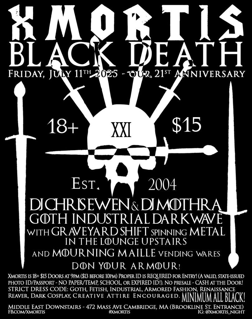 DJ Chris Ewen & DJ Mothra spin Goth, Industrial, & Darkwave with Graveyard Shift spinning Metal in the Lounge area upstairs and Mourning Maille vending wares! We’ve brought this theme out of our archives & mixed in elements from the Xmortis the Barbarian theme that some of you have been asking for!